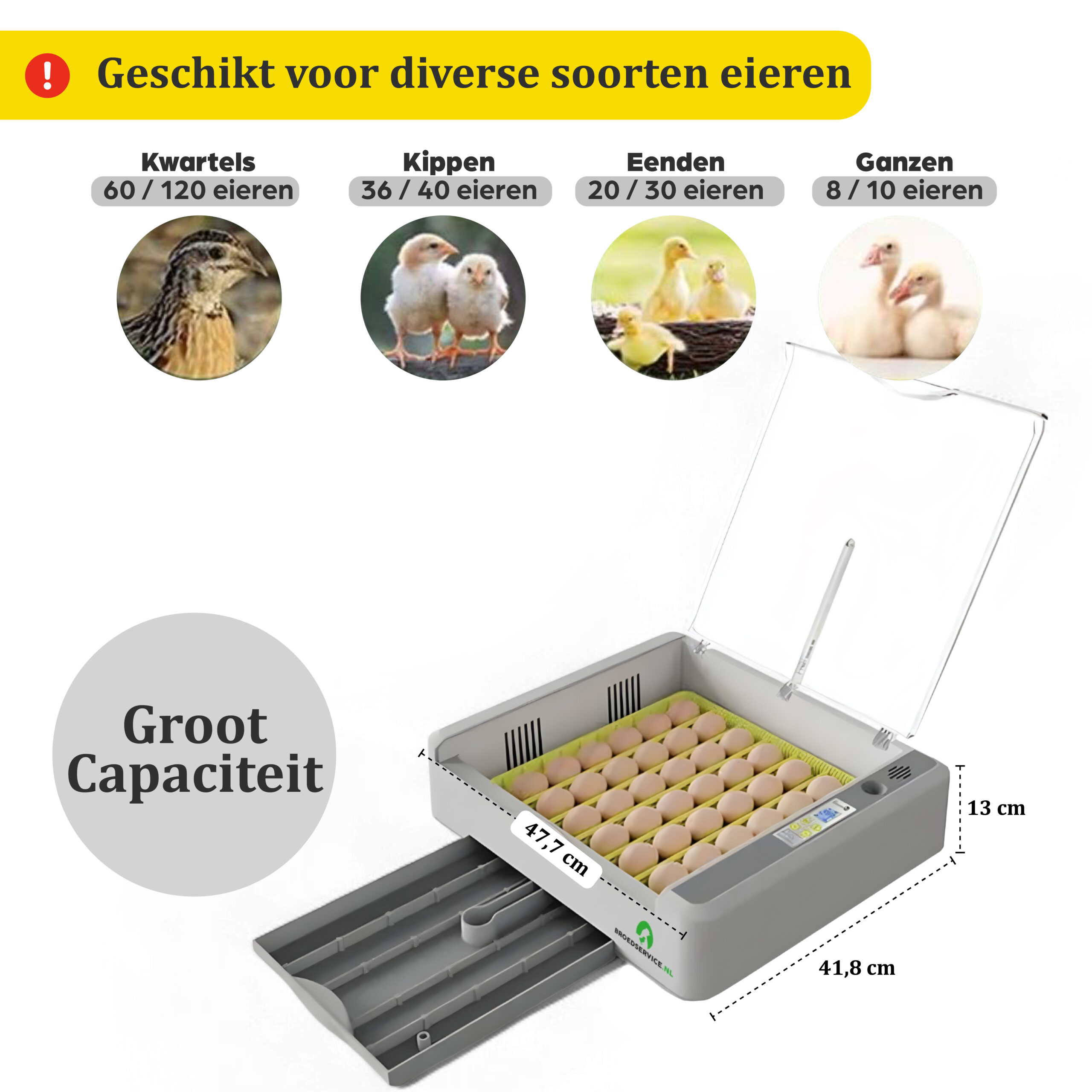 Geschikt voor diverse eiersoorten: Deze veelzijdige broedmachine is geschikt voor verschillende soorten eieren, waaronder (36-40) kippeneieren, (30-36) eendeneieren, (60-120) kwarteleieren, (60) duiveneieren of (60) papegaaieneieren.
