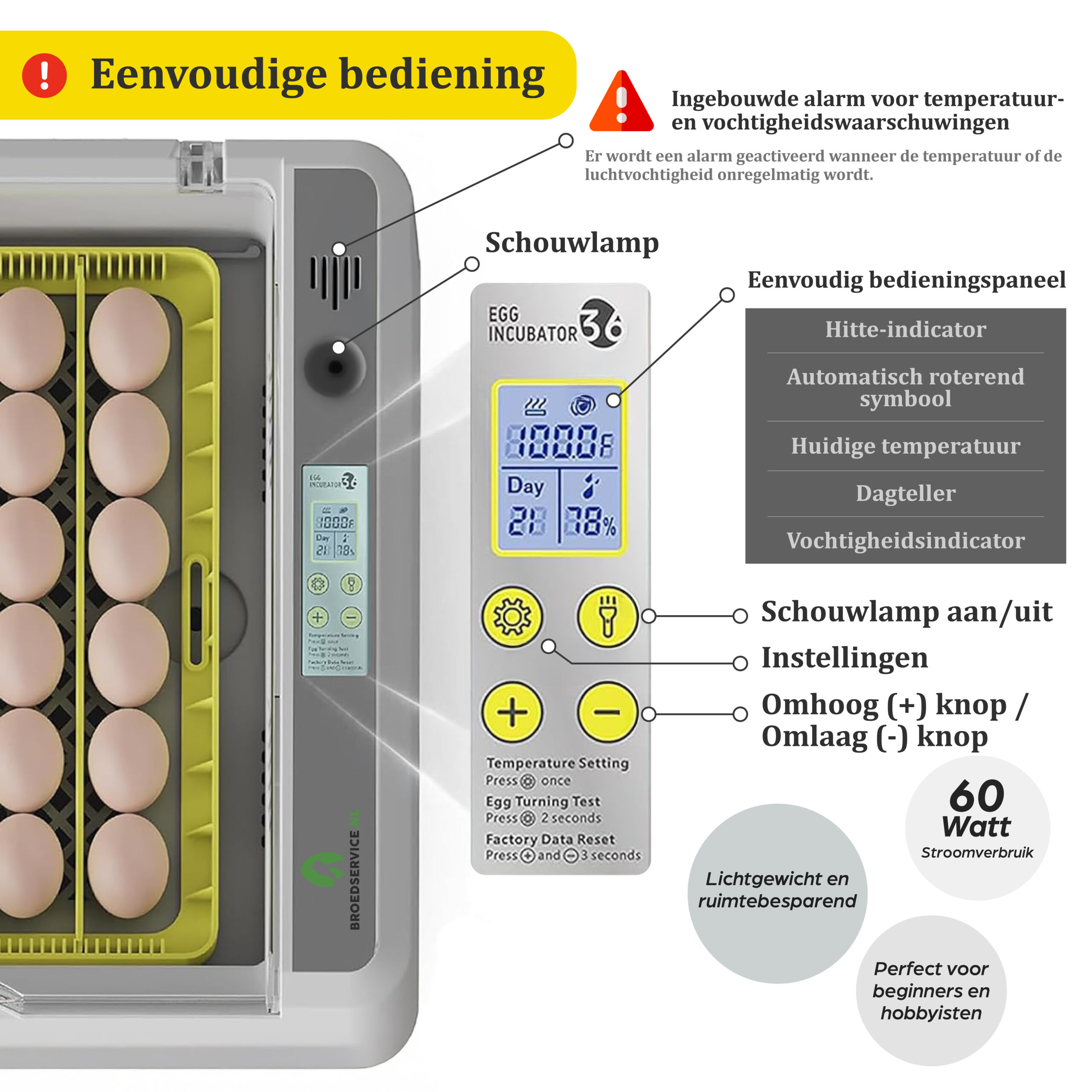 ✅ Energiezuinig: Met slechts 60 Watt energieverbruik is onze broedmachine niet alleen krachtig maar ook energiezuinig, waardoor je kosten bespaart.