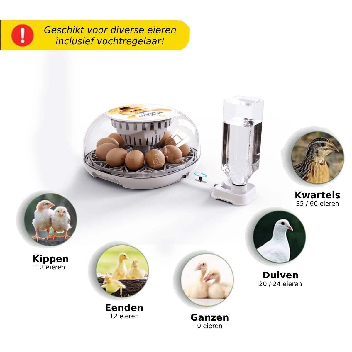 Deze broedmachine is geschikt voor (12)kippen, (9-10)eenden, (35-60)kwartels, (35)duiven of (20)papegaaien eieren.