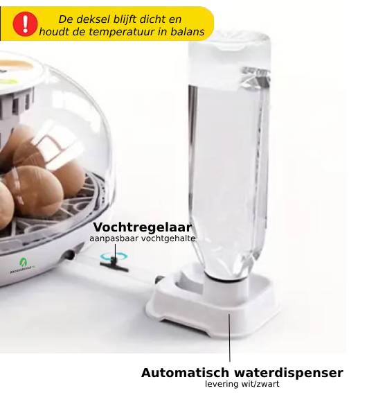 Bij aankoop wordt deze automatische broedmachine MET een flesje geleverd. Een willekeurig 500ml flesje van cola, fanta, spa, enz., kan dienen als waterreservoir, wat het gebruik nog gemakkelijker maakt.
