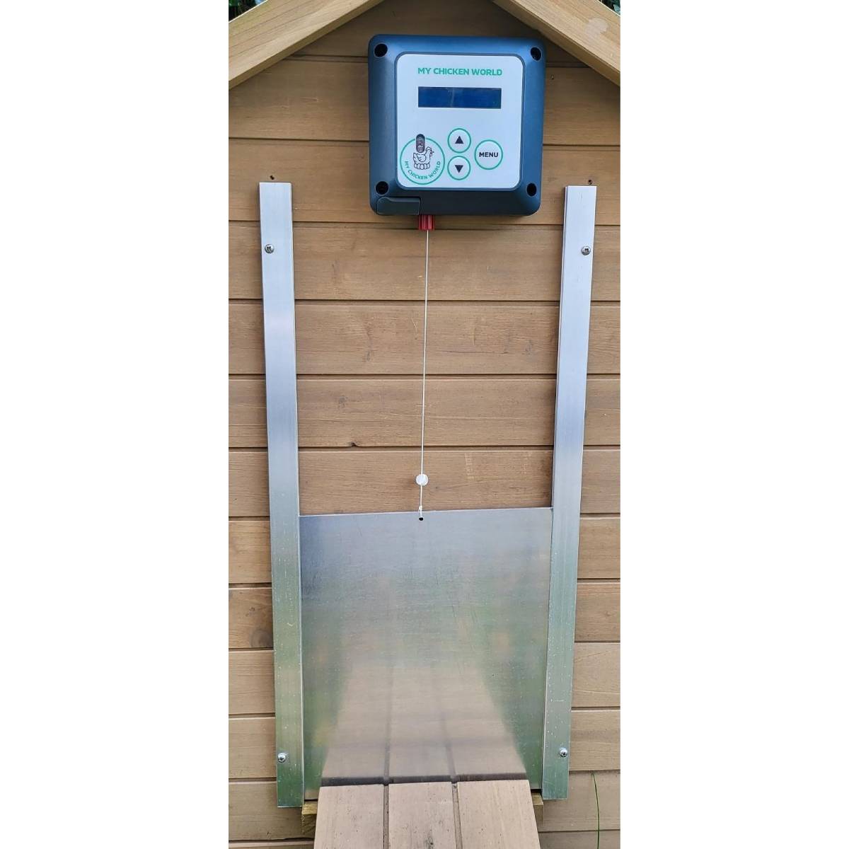 Het meegeleverde metalen deurtje van 23 x 30 a 34 cm, zodat zelfs de sluwste roofdieren zoals vossen en marters het hok niet kunnen binnendringen. Het deurtje opent en sluit op metalen-rails van 58 cm en kan luikjes tot 1 kg tillen. Zo ben je verzekerd van maximale veiligheid voor je pluimvee.