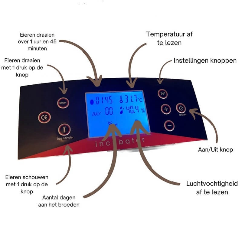 Programmeerbaar voor Uw Gemak: U kunt de temperatuur, draai-intervallen en incubatietijd naar wens programmeren. Daarnaast is er een automatische belichtingsfunctie beschikbaar voor het schouwen van eieren vanaf de bodem.