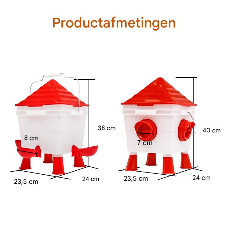 Voor een totaaloplossing kunt u de Voerbak 8,5kg combineren met de Drinkbak 8,5 liter. Samen bieden ze een complete voer- en drinkoplossing voor uw pluimvee. Terwijl de voerbak vier feeders heeft voor gecontroleerde voeding, beschikt de drinkbak over vier drinkcupjes voor constante toegang tot schoon drinkwater.