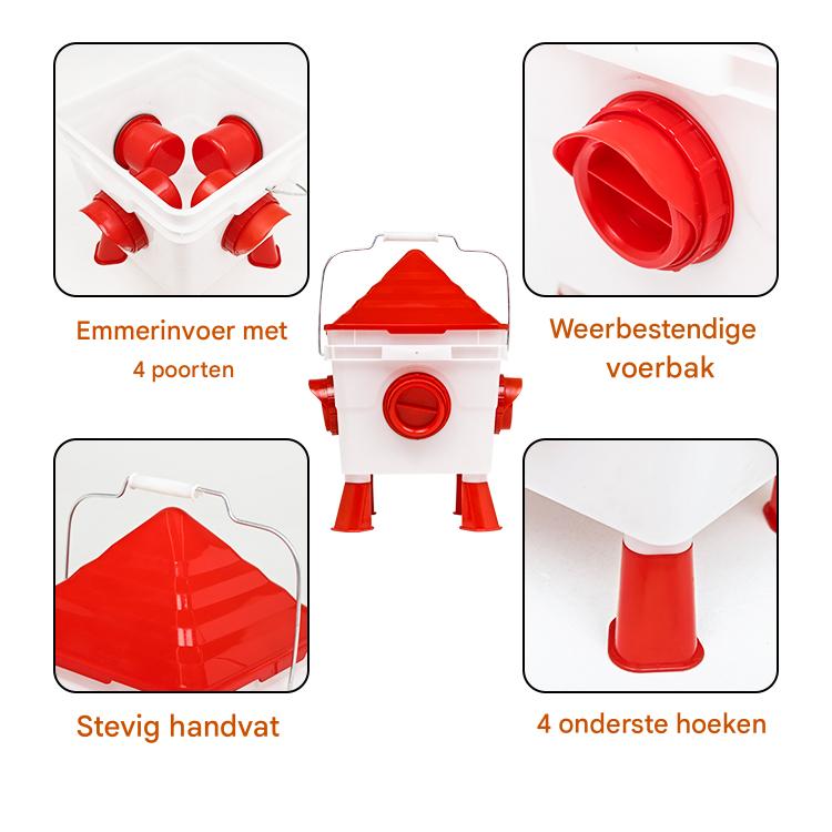 5. Hygiënisch en Verhoogd: De voerbak is uitgerust met een verhoogde stand, zodat het voer vrij blijft van vuil en mest. Dit zorgt voor een veilige en schone voedingsomgeving.