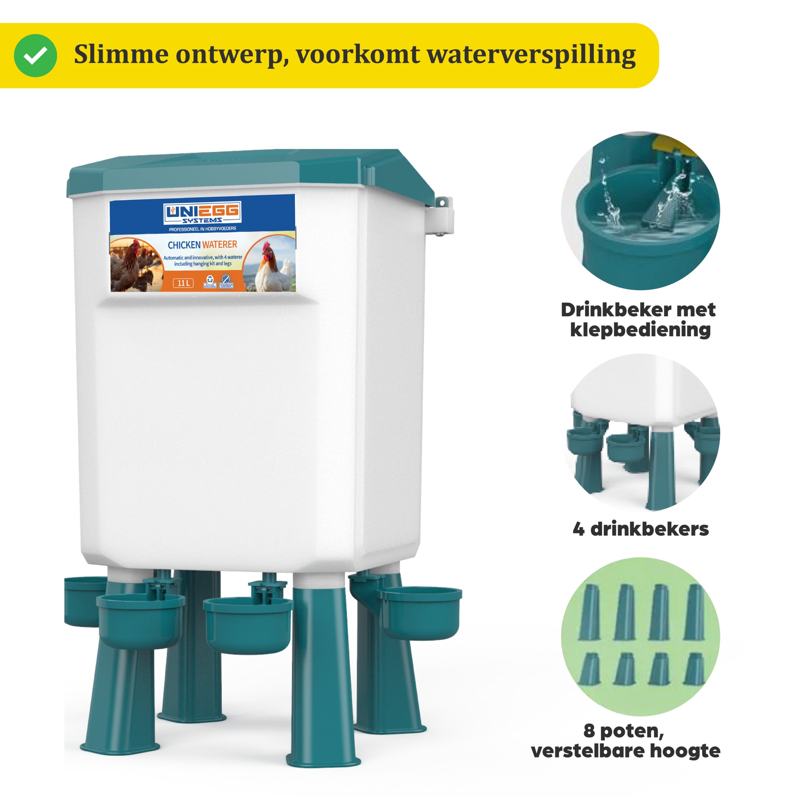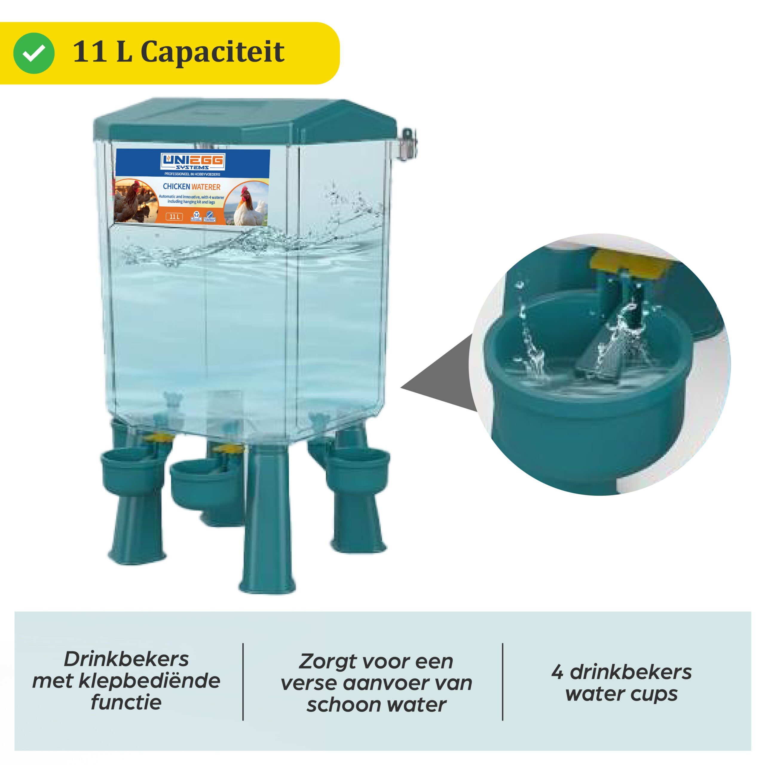 De Reservoir Drinker is een geavanceerd drinksysteem met een royale capaciteit van 11 liter. Het automatische vulsysteem zorgt ervoor dat water automatisch naar beneden zakt, waardoor uw dieren altijd toegang hebben tot vers drinkwater. Deze innovatieve drinker minimaliseert verspilling, voorkomt ongedierte en elimineert de dagelijkse bijvulling. Door de verhoogde positie van de drinkbakken blijft het water altijd fris en schoon. Verbeter het drinkproces voor uw pluimvee met de Reservoir Drinker en bied uw dieren een efficiënte, schone en geoptimaliseerde drinkervaring.